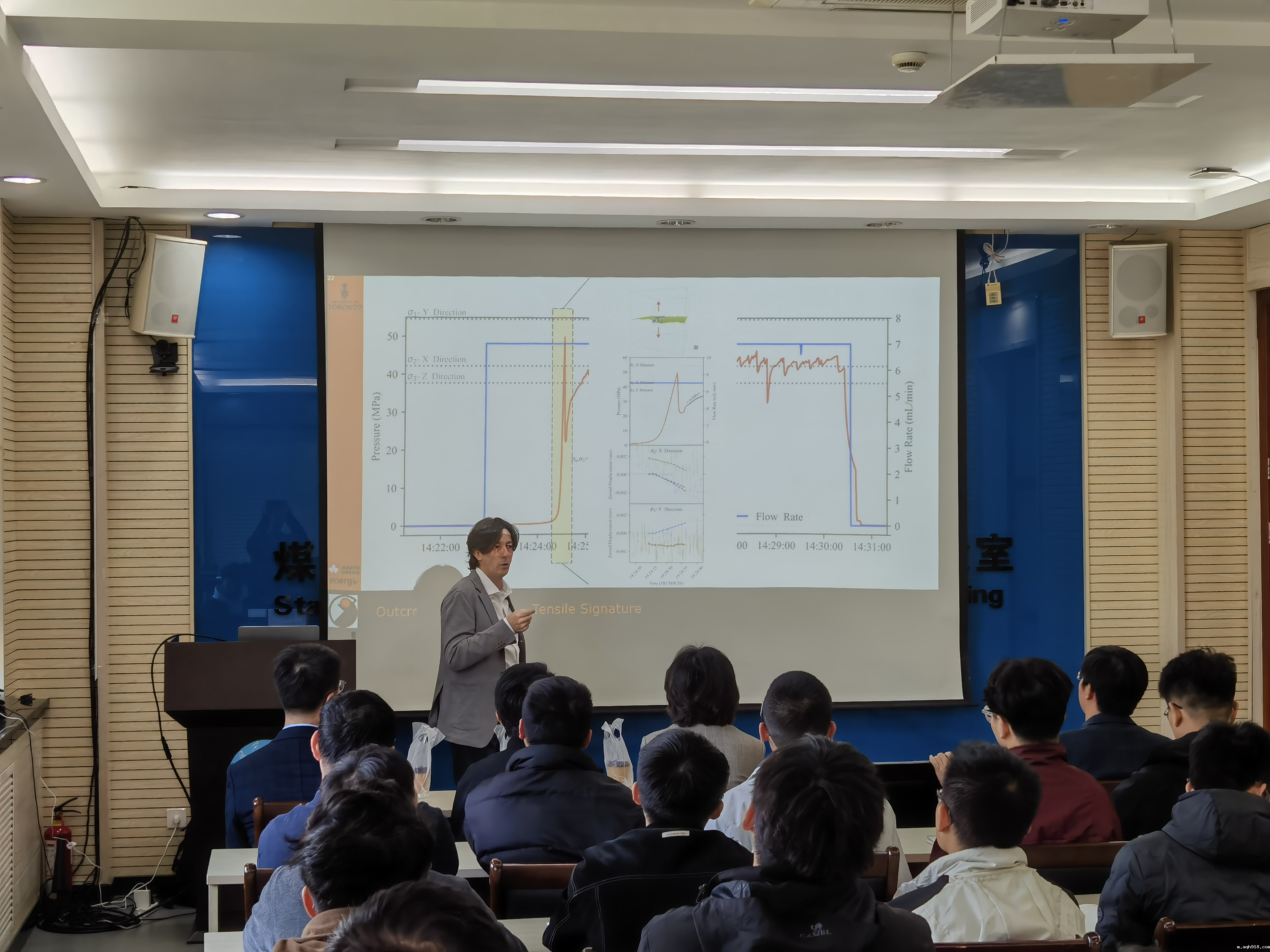 参观结束后,Giovanni Grasselli教授在雷竞技iphone下载B415作了题为“The Interplay Between Stress and Material Heterogeneity during Hydraulic Fracturing”的学术报告,介绍了团队最新的研究进展,主要包括页岩的真三轴压裂裂缝起裂及扩展规律、抗拉强度各向异性及层面等因素对水压裂缝扩展路径的影响规律、基于工程现场中油气开采的微震事件响应特征等,与会老师和同学积极提问,双方进行了深入的交流探讨。